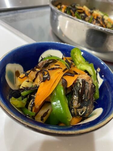 サバ缶とひじきを使ってサバ缶とひじきの煮物を作りました。サバ缶、ひじき どちらも体に良さげです。ピーマンは 一番栄養のある種も使います。15分あれば完成。