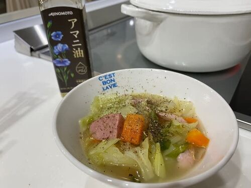 「北の国から」ワインももハムを使って、野菜スープを作りました。お水は入れていません。手を掛けたのは10分、あとは煮込むだけ。使った調味料は、オリーブオイル、アマニ油、コンソメ顆粒、塩コショウ、ローリエ
