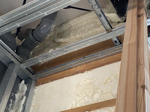 グラスウールの断熱材も入っていたのですが、 それに加えて、 吹付充填式 現場発泡ウレタン工事 外壁内壁の厚みというのは、普通180mmですが、 外壁は 今後タイルやサイディングを貼ることになり、 内側も新たにを壁を起こすので、外壁・内壁の厚みは25…