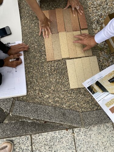 10月2日、現地にて打合せをしました。 外壁を サイディングではなく、タイルを1枚1枚 湿式工法で貼ってもらいます。 外壁タイル、3グループを選ぶ。 下の写真、女性の建築士さんです。 「この3種を 2対2対3の割合で、貼ってください。」と夫が。 以…